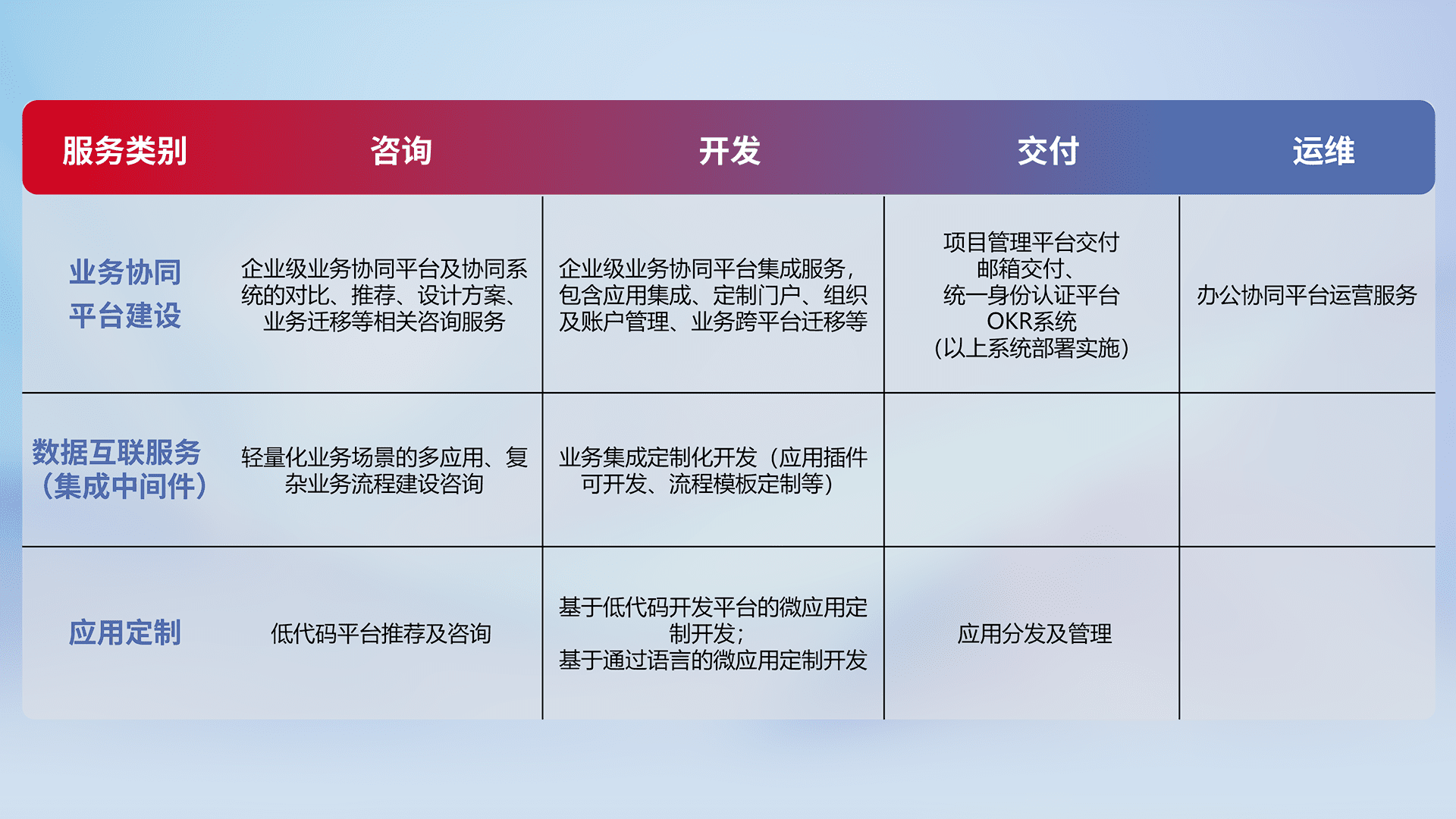 针对钉钉、、企微、、IDaas等平台级产品提供产品的规划、、、、方案、、、交付、、定制化开发等服务,,,实现如统一协同办公、、、智能客户服务、、混合会议管理、、智能数据查询、、、、等业务场景,,,实现数字化转型。。。。